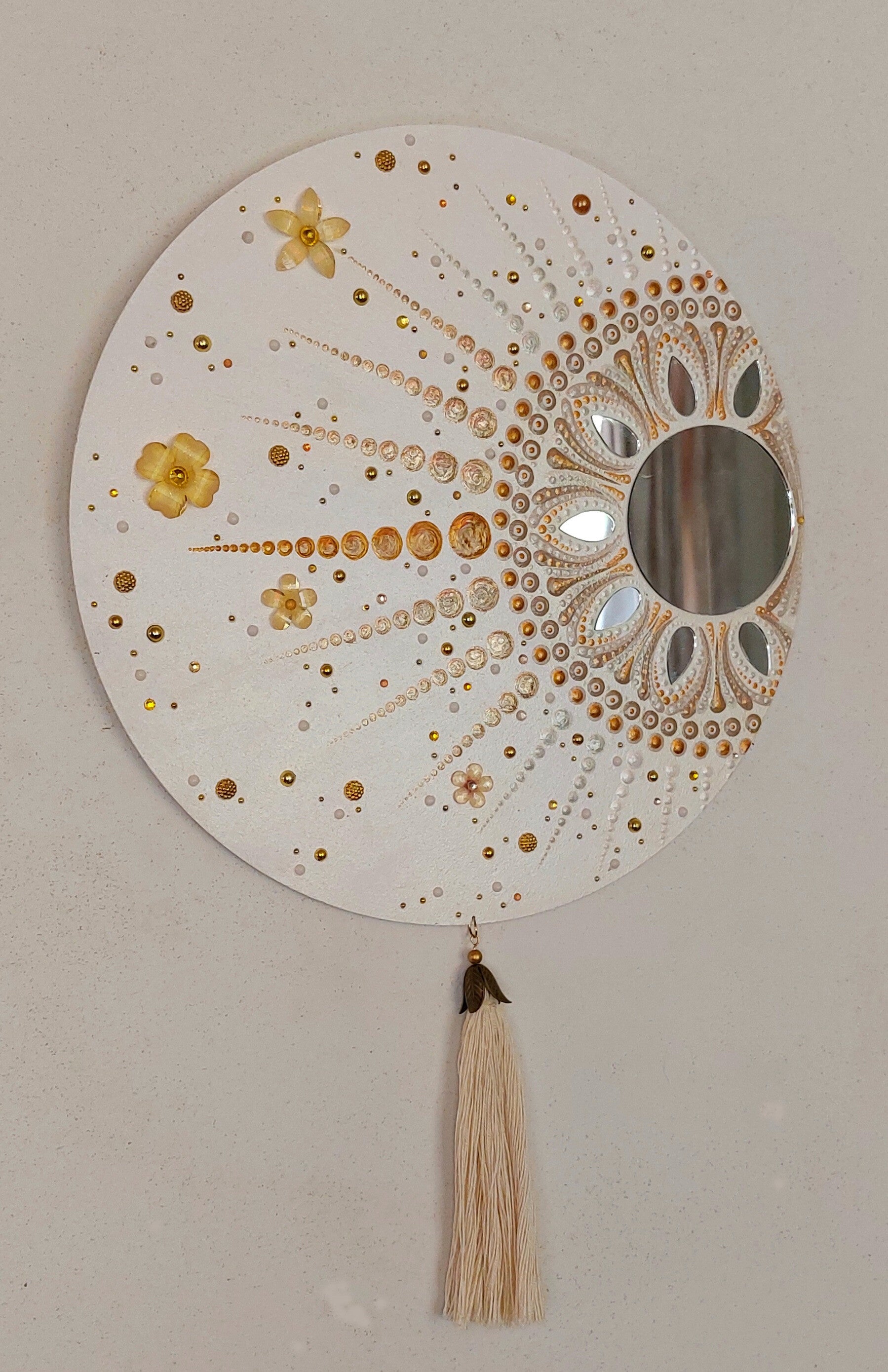 Deze mandala stipwerk gecombineerd met spiegels, bloemenbedels en knopjes. Onder hangt met een klosje van katoen met eindkapje in de vorm van een bloemkelk. De kleuren die gebruikt zijn: Emperor's Gold; Worn Penny; Champagne Gold; Oyster Pearl en White Pearl. De houten cirkel is 30cm doorsnede en 3mm dik. Het klosje is 14cm lang.