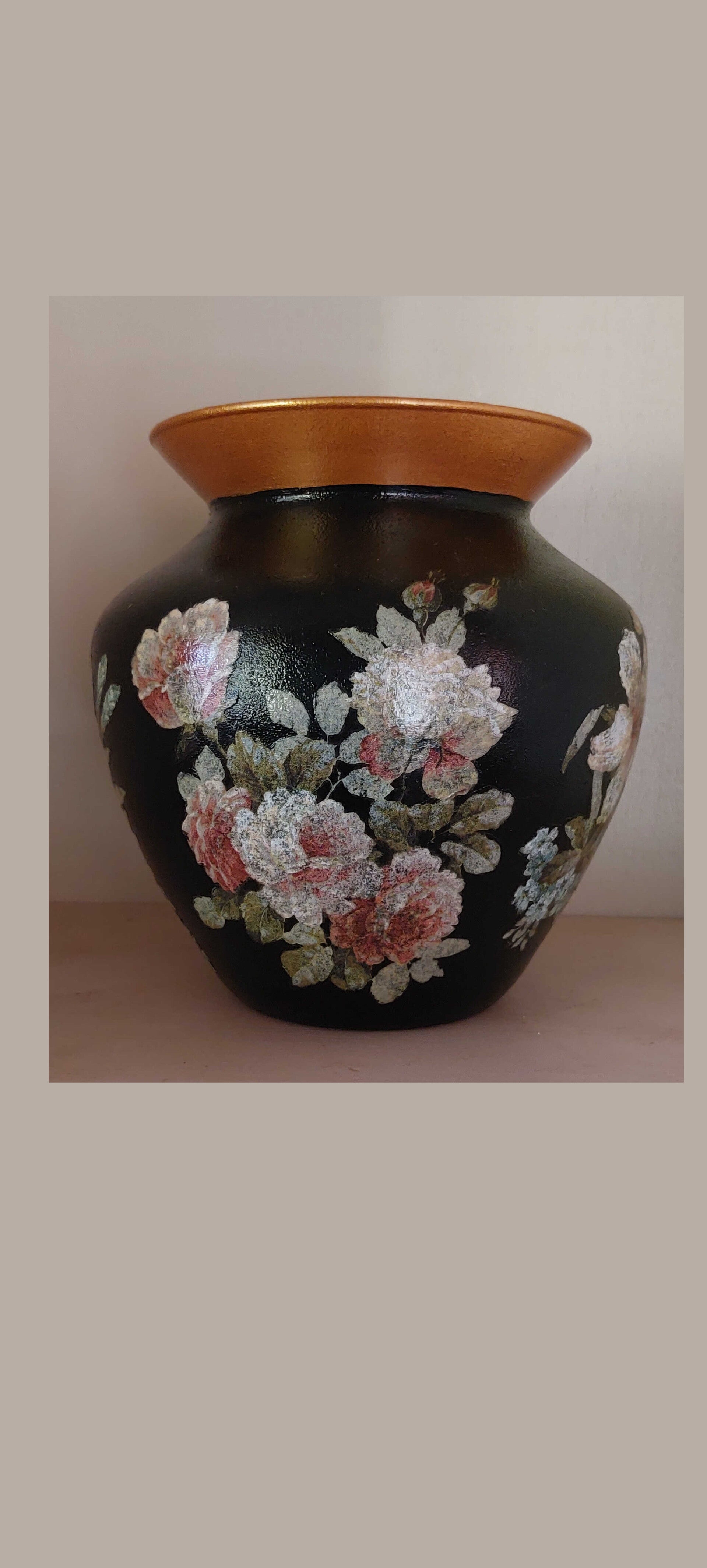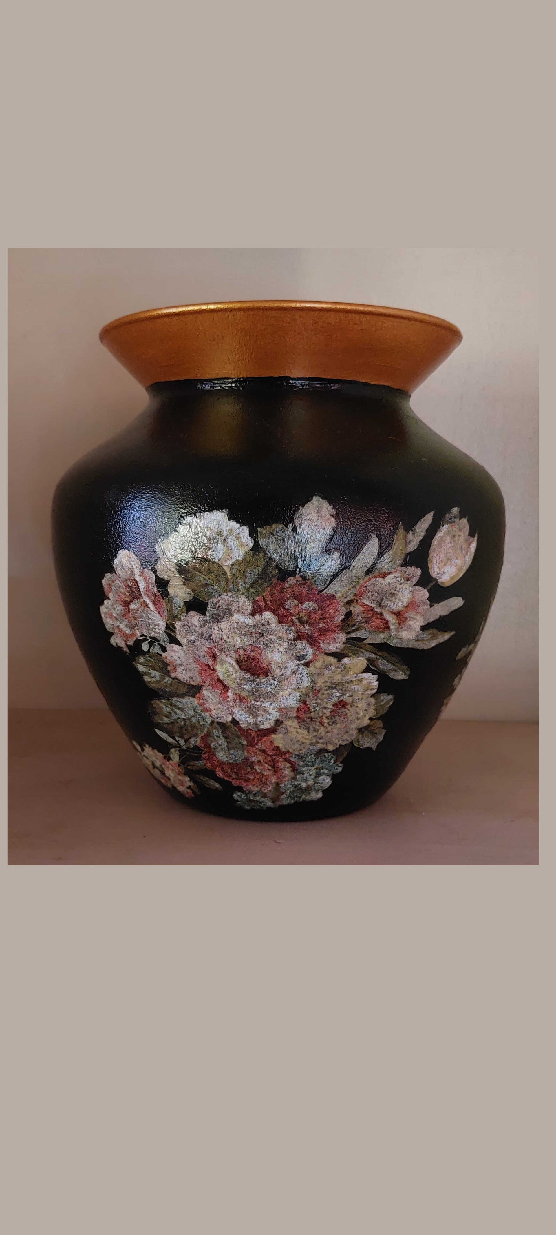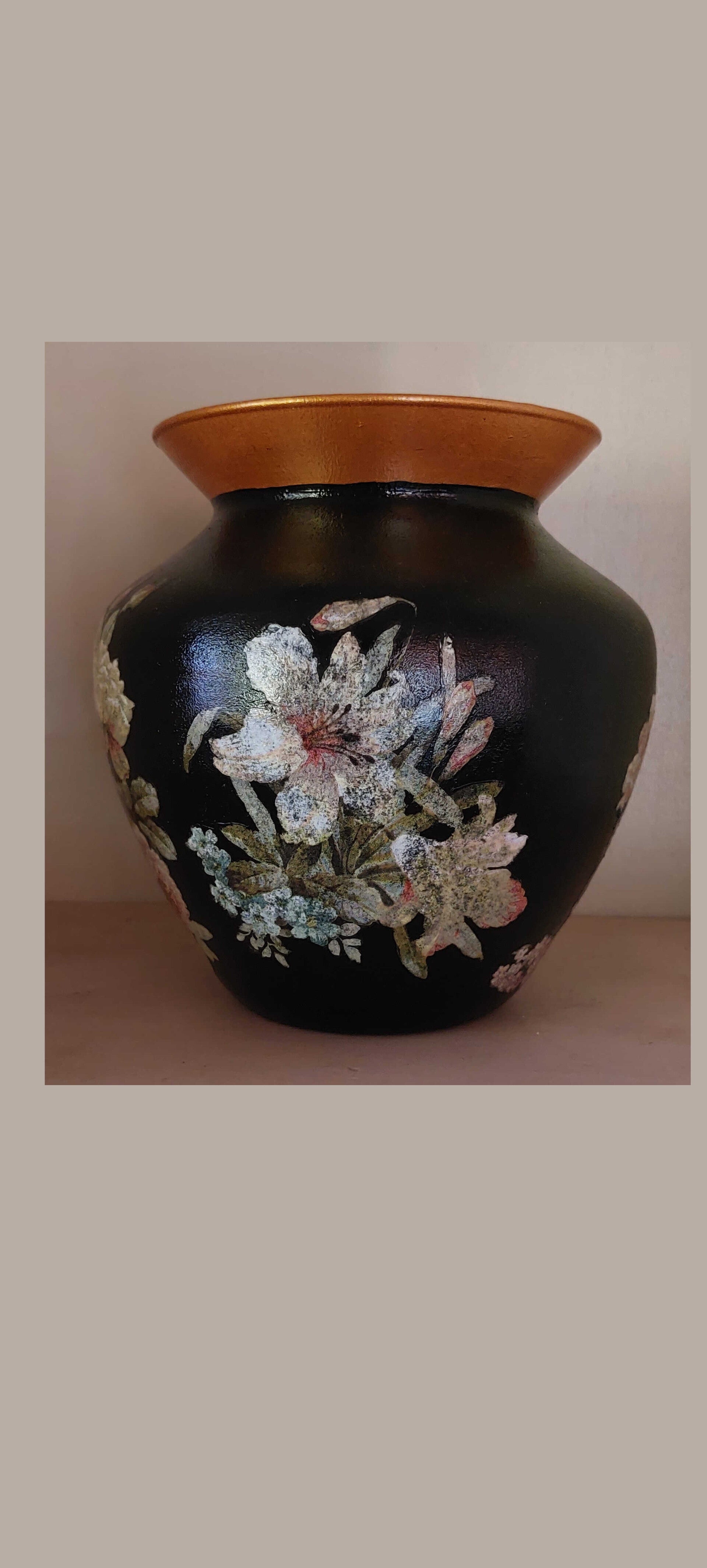 Dit is echt klassiek. De bloemen in stijl van de oude meesters met zwart en goud. Het zwart komt iets door de servetten heen, wat een oude look geeft. Afgelakt met hoogglans vernis. Vaas is 20cm hoog en doorsnede van 62cm op de dikste bolling.