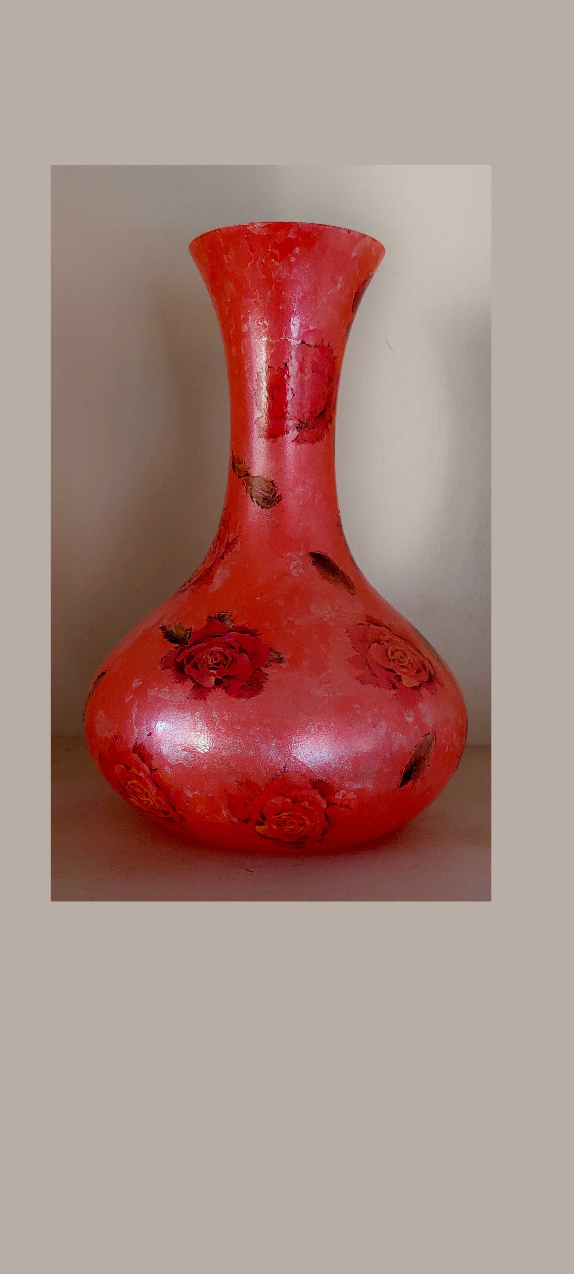 Sierlijk, bol buikje en een ranke hals. De vaas is eerst bewerkt met parelmoer wit en daarna licht craquelé effect, waardoor het parelmoer licht door de rode deklaag komt. Gedecoreerd met roosjes. Klassieken opvallend. Vaas is 23cm hoog en op het dikste punt 52cm doorsnede.